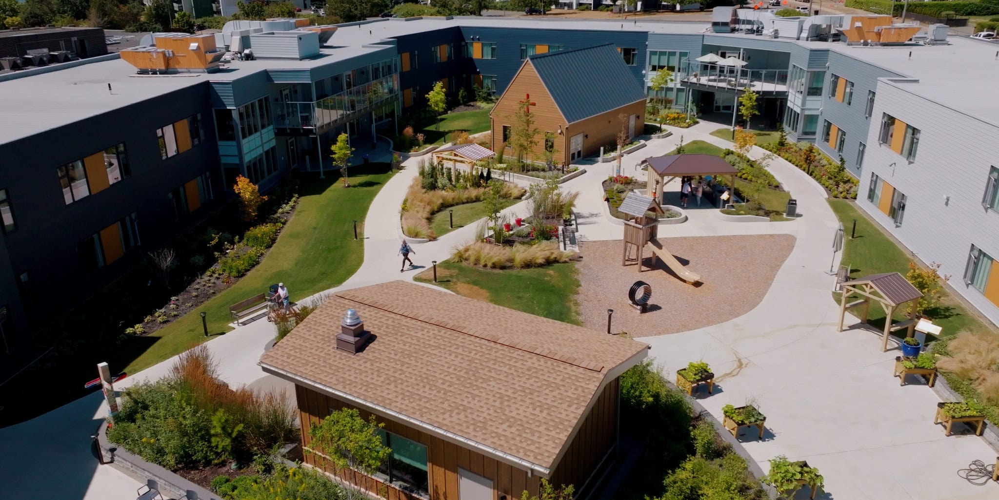 Residents enjoy household kitchens, communal dining, art room, sewing machines, shared courtyards and gardens that residents can visit at their leisure, a coffee shop, a grocery store, a hair salon, and opportunities for outdoor recreation, offering a true home-like environment.